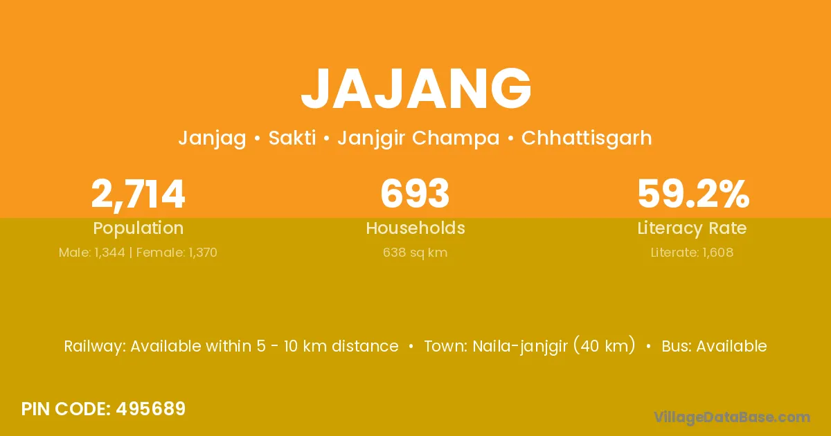 Naila-janjgir (40 km) is the nearest town to Jajang village for major economic activities and is located approximately 40 km away.