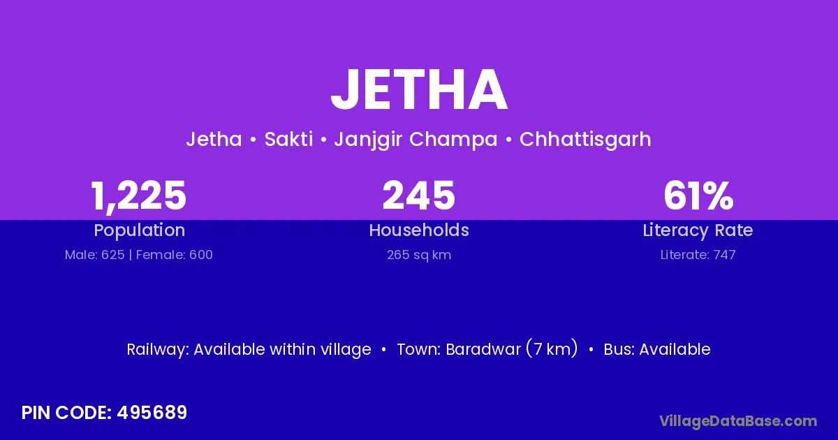 According to Census 2011 information, the village code of Jetha village is 495689.