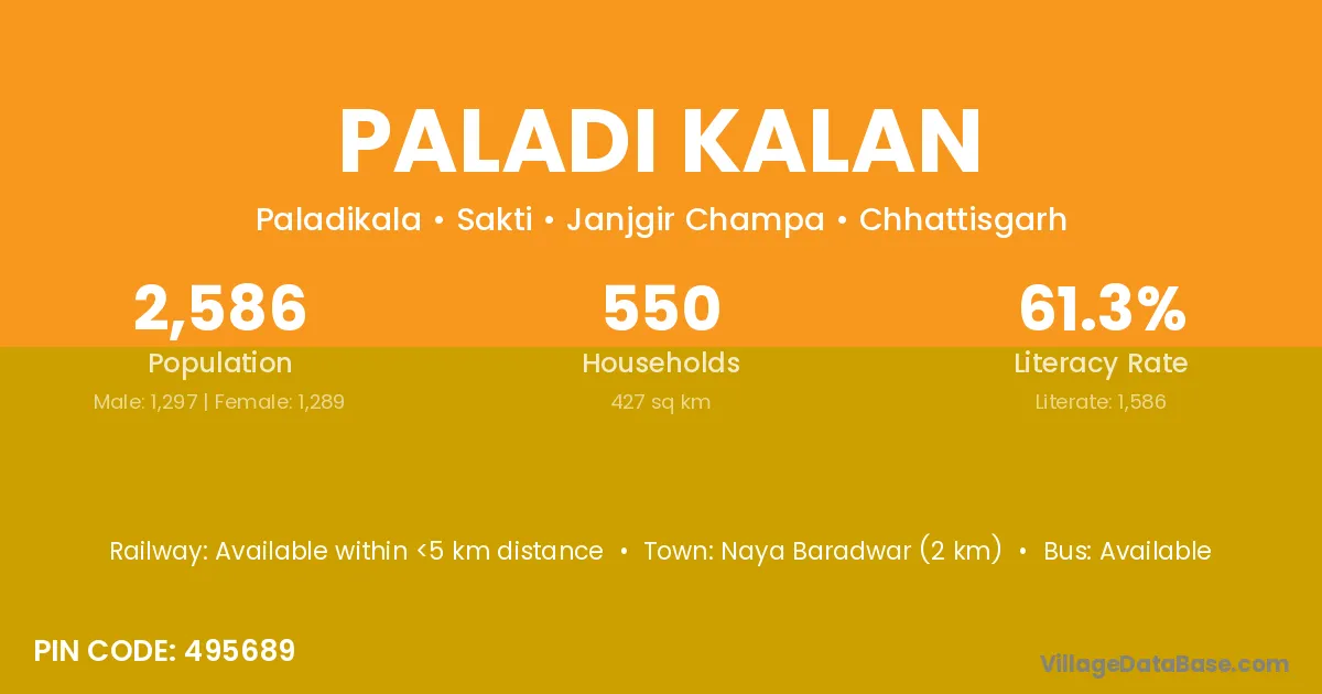 Paladi Kalan village has a total population of 2,586 people, of which 1,297 are males and 1,289 are females.