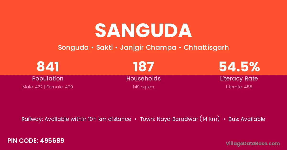Sanguda village has a total population of 841 people, of which 432 are males and 409 are females.