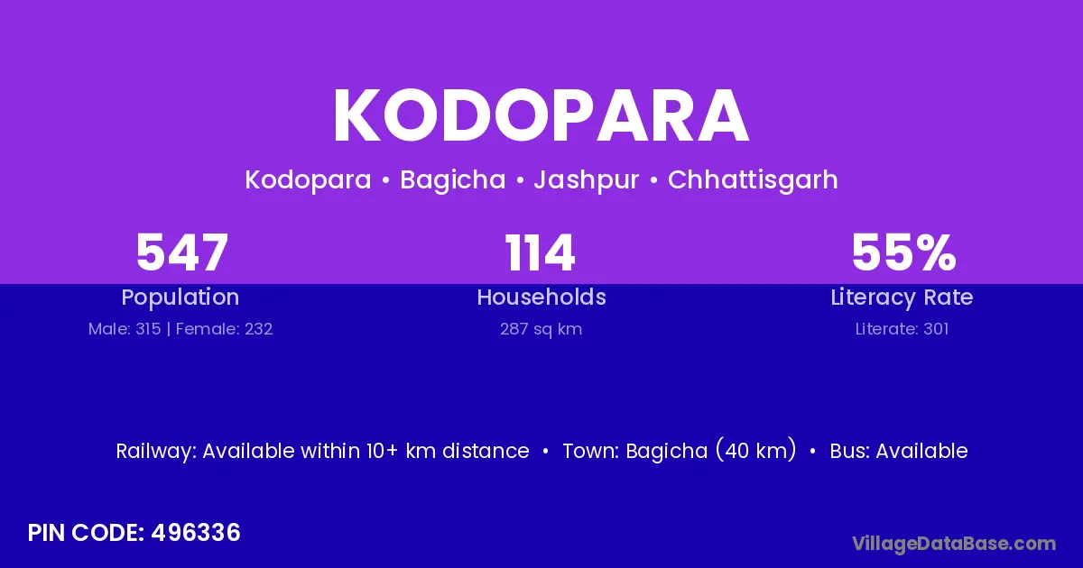 Bagicha (40 km) is the nearest town to Kodopara village for major economic activities and is located approximately 40 km away.