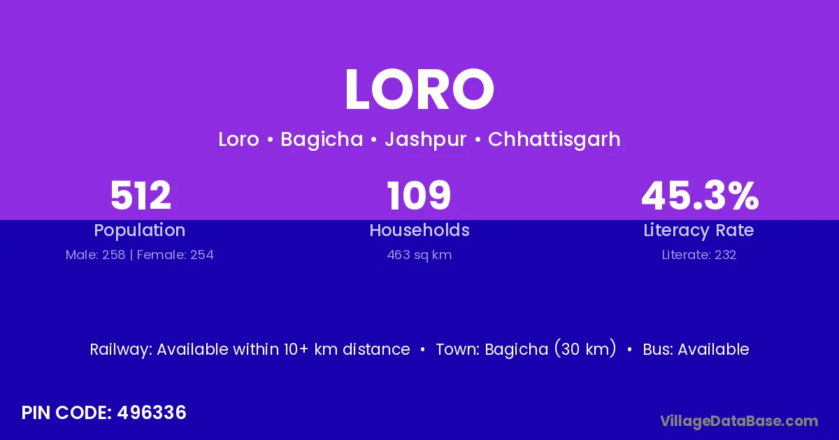 Loro village is located in the Bagicha Tehsil of the Jashpur district in Chhattisgarh .