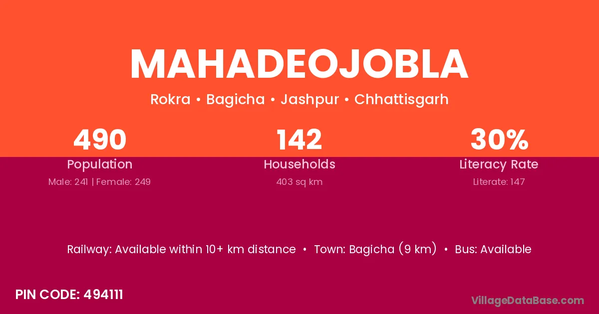 Mahadeojobla village has a total population of 490 people, of which 241 are males and 249 are females.