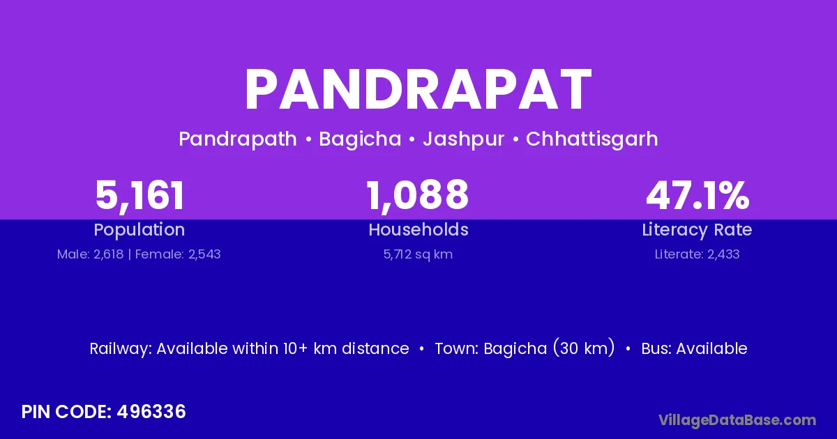 Bagicha (30 km) is the nearest town to Pandrapat village for major economic activities and is located approximately 30 km away.