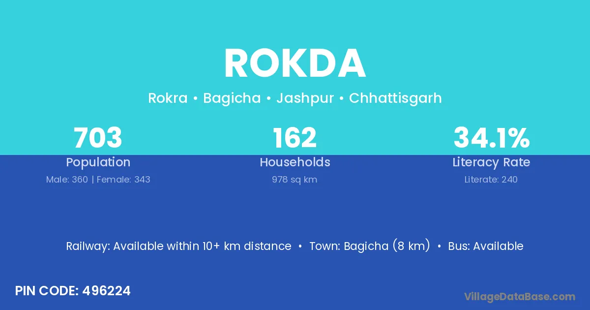 Bagicha (8 km) is the nearest town to Rokda village for major economic activities and is located approximately 8 km away.