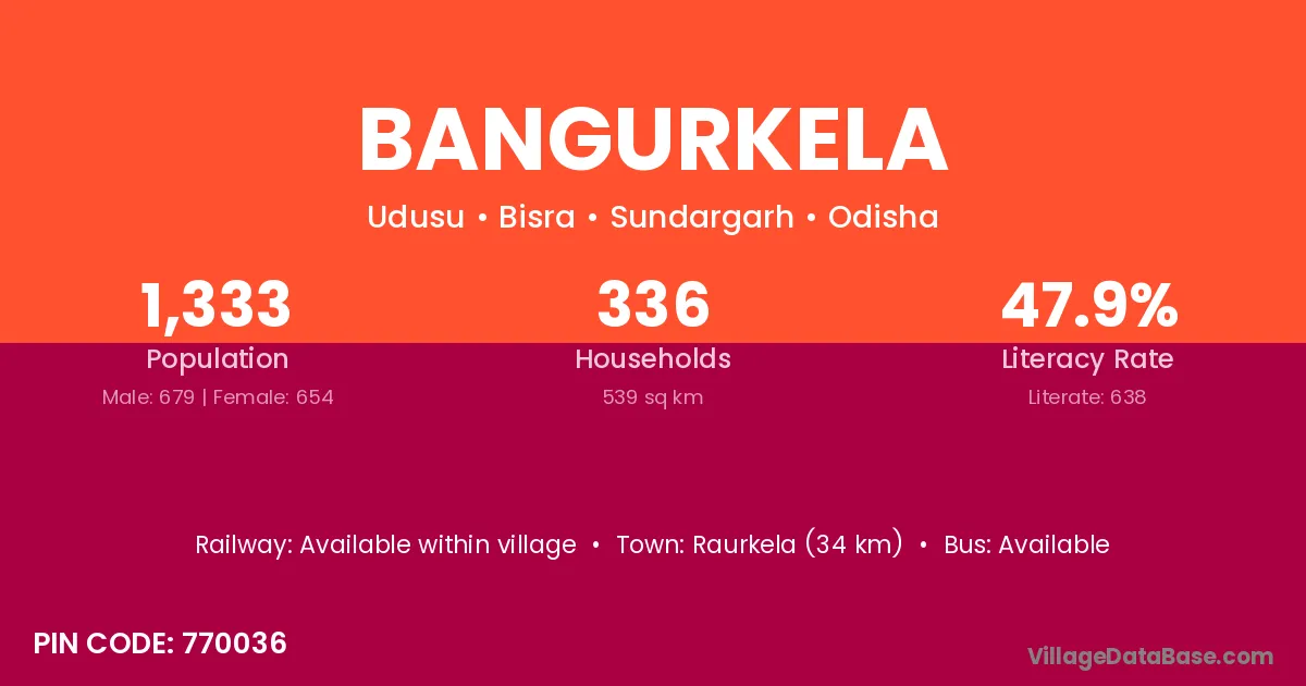 Jashpur Nagar (32 km) is the nearest town to Bangurkela village for major economic activities and is located approximately 32 km away.