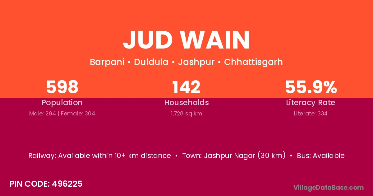Jashpur Nagar (30 km) is the nearest town to Jud Wain village for major economic activities and is located approximately 30 km away.