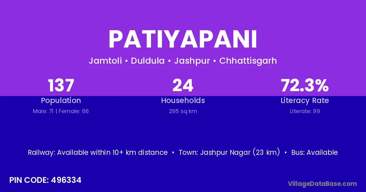 Jashpur Nagar (23 km) is the nearest town to Patiyapani village for major economic activities and is located approximately 23 km away.