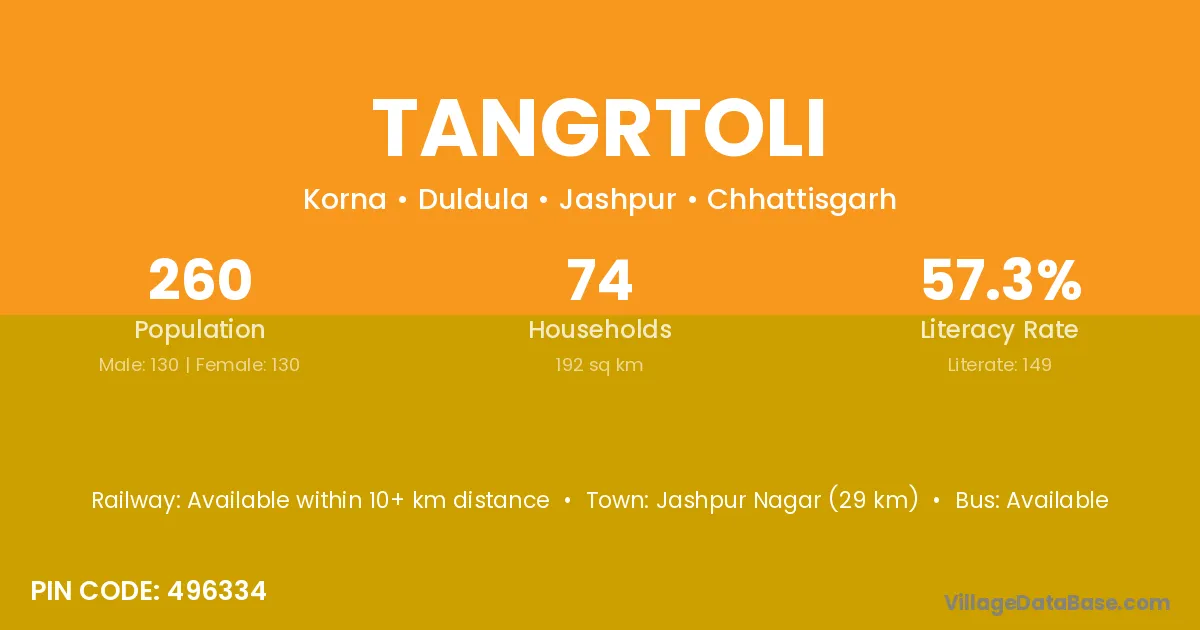 Jashpur Nagar (29 km) is the nearest town to Tangrtoli village for major economic activities and is located approximately 29 km away.