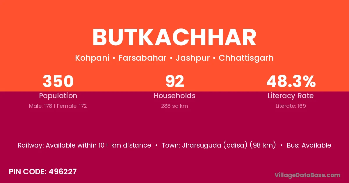 Jharsuguda (odisa) (98 km) is the nearest town to Butkachhar village for major economic activities and is located approximately 98 km away.