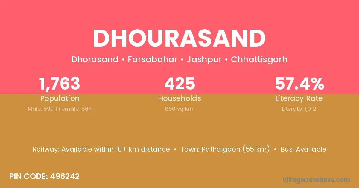 Pathalgaon (55 km) is the nearest town to Dhourasand village for major economic activities and is located approximately 55 km away.