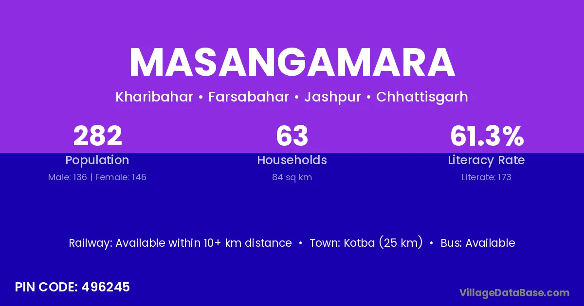Kotba (25 km) is the nearest town to Masangamara village for major economic activities and is located approximately 25 km away.