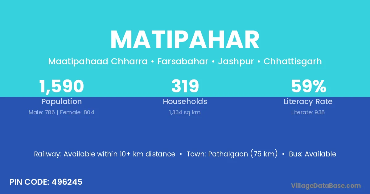 Pathalgaon (75 km) is the nearest town to Matipahar village for major economic activities and is located approximately 75 km away.