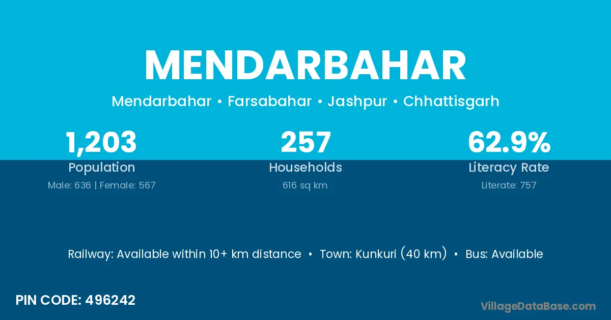 Kunkuri (40 km) is the nearest town to Mendarbahar village for major economic activities and is located approximately 40 km away.
