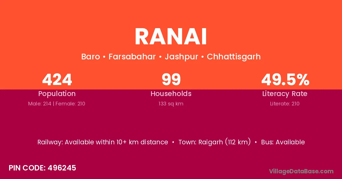 Raigarh (112 km) is the nearest town to Ranai village for major economic activities and is located approximately 112 km away.