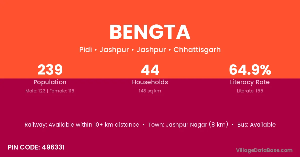 Jashpur Nagar (8 km) is the nearest town to Bengta village for major economic activities and is located approximately 8 km away.
