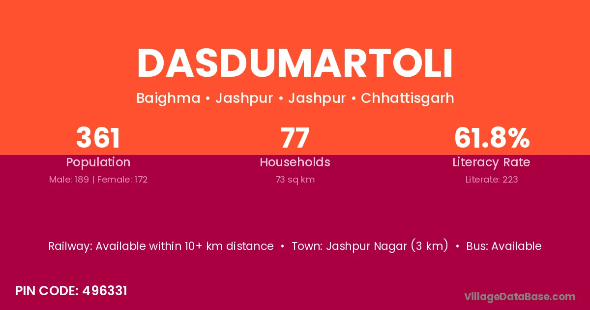 Jashpur Nagar (3 km) is the nearest town to Dasdumartoli village for major economic activities and is located approximately 3 km away.