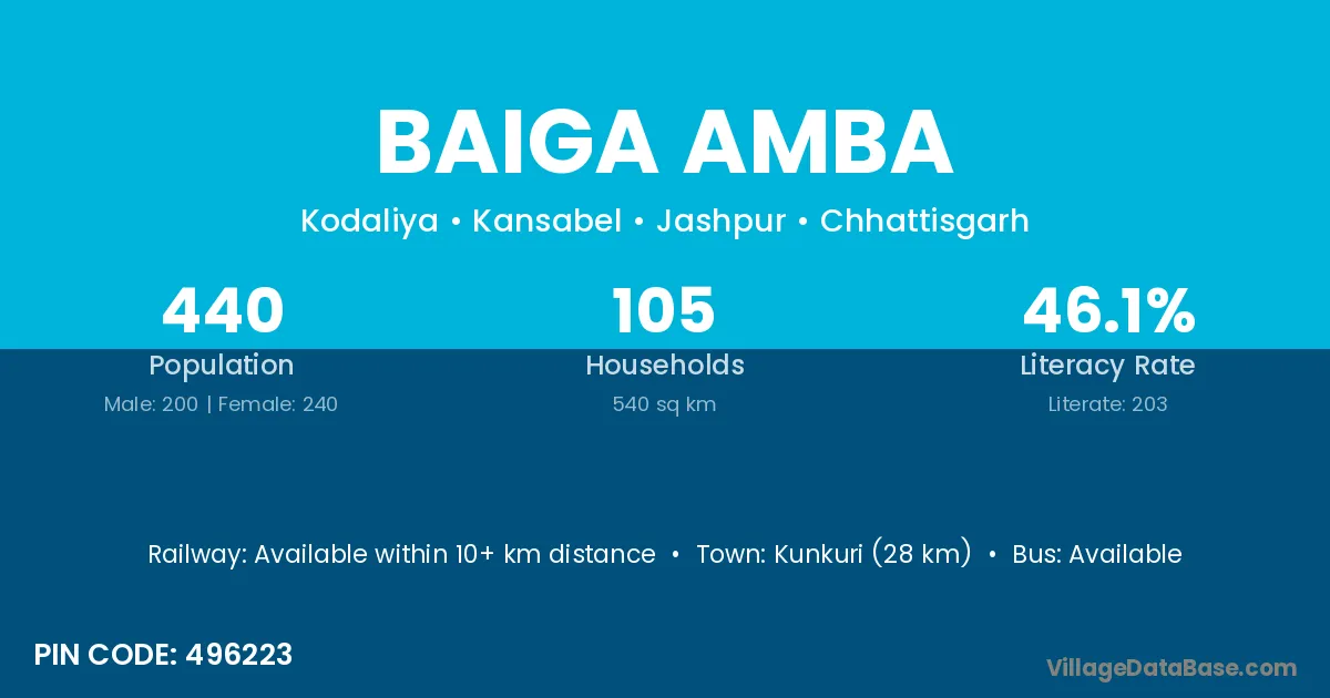 Kunkuri (28 km) is the nearest town to Baiga Amba village for major economic activities and is located approximately 28 km away.