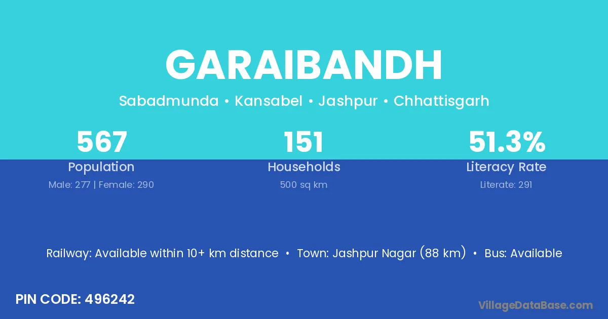 Jashpur Nagar (88 km) is the nearest town to Garaibandh village for major economic activities and is located approximately 88 km away.