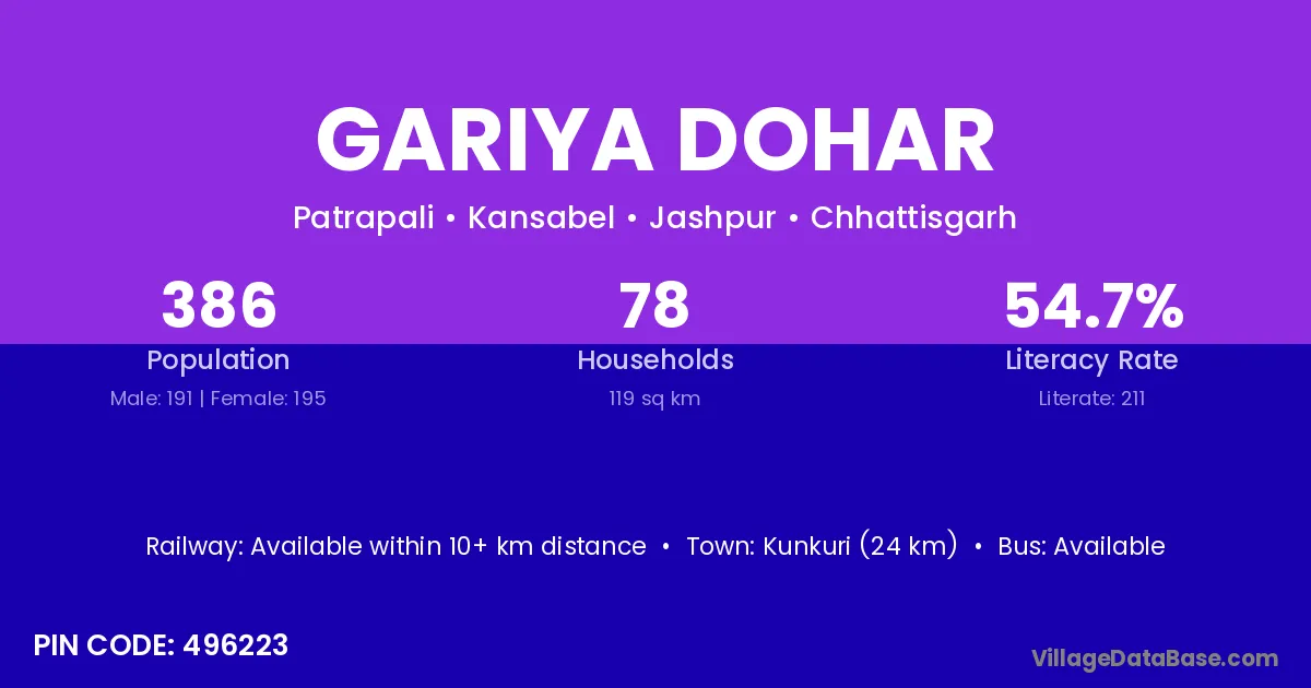 Kunkuri (24 km) is the nearest town to Gariya Dohar village for major economic activities and is located approximately 24 km away.