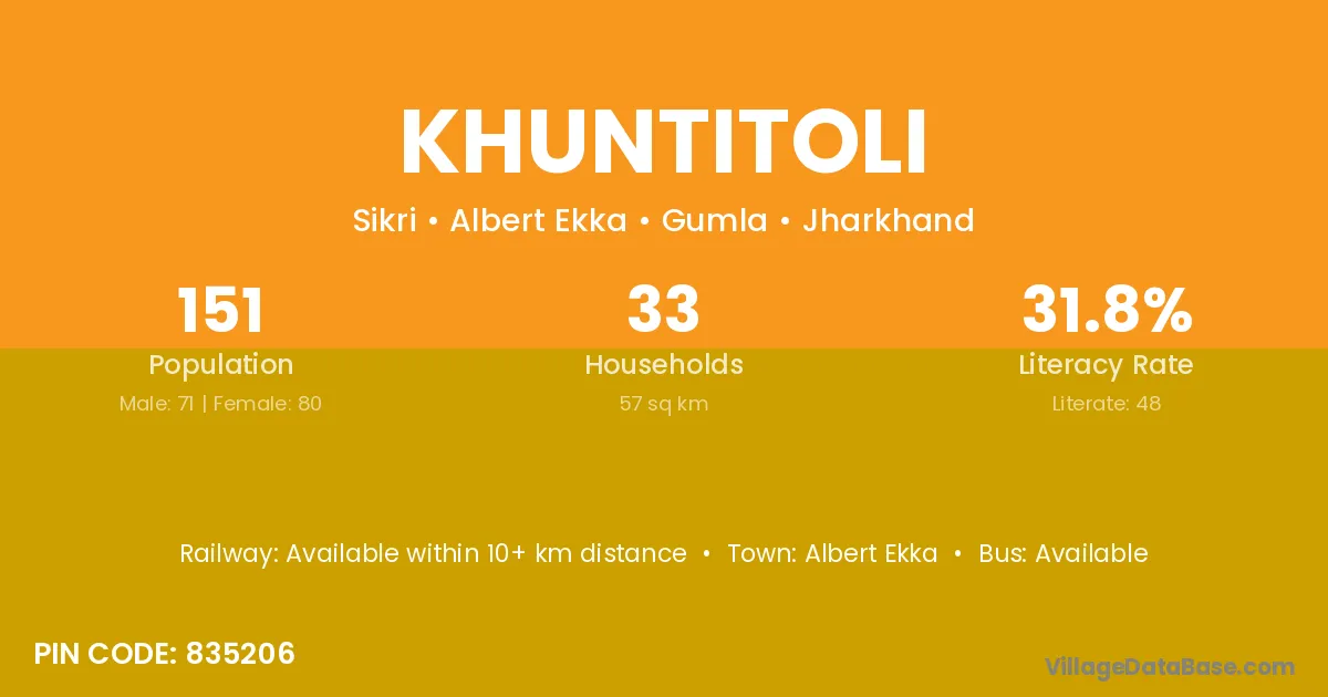 Kunkuri (24 km) is the nearest town to Khuntitoli village for major economic activities and is located approximately 24 km away.