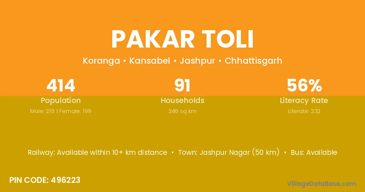 Jashpur Nagar (50 km) is the nearest town to Pakar Toli village for major economic activities and is located approximately 50 km away.