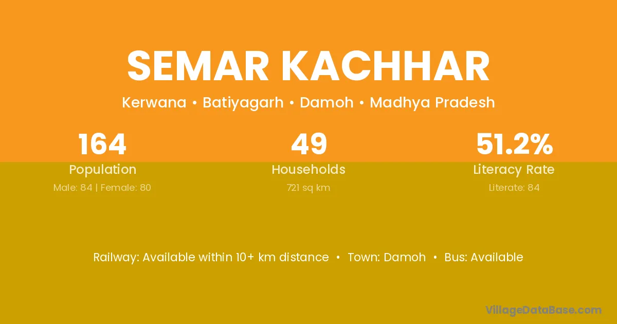 Jashpur Nagar (84 km) is the nearest town to Semar Kachhar village for major economic activities and is located approximately 84 km away.