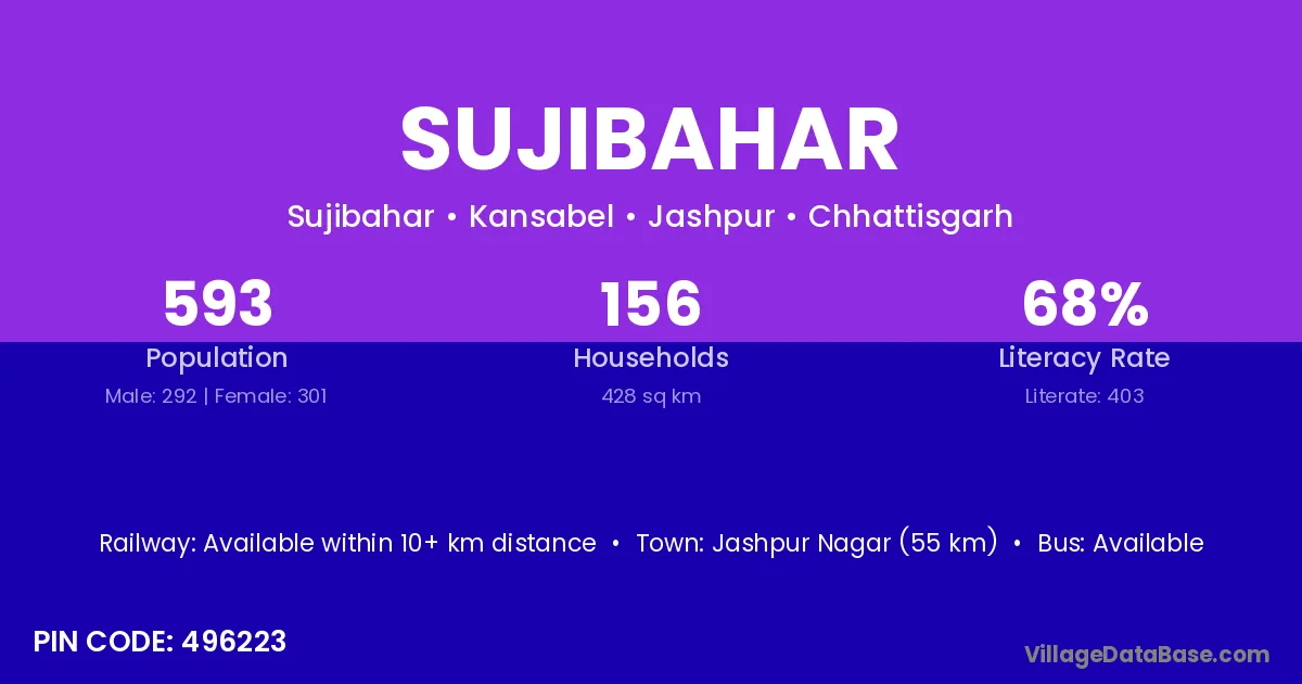 Jashpur Nagar (55 km) is the nearest town to Sujibahar village for major economic activities and is located approximately 55 km away.