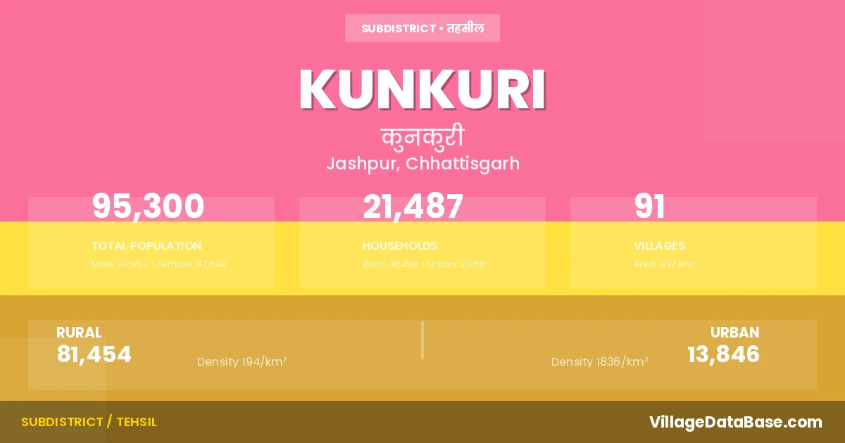 According to the 2011 census The total area of Kunkuri Tehsil is 427 km², with a population of 95300 people. The population density is 223 inhabitants per square kilometre, and there are approximately 21487 houses in the sub district.