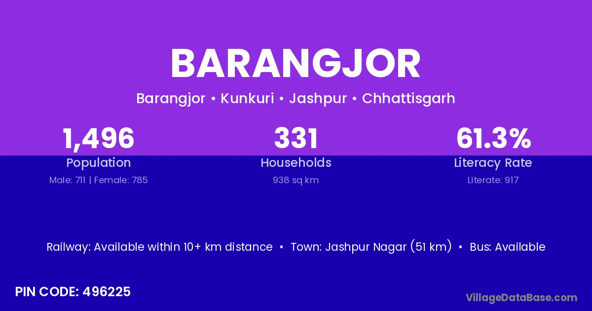 Jashpur Nagar (51 km) is the nearest town to Barangjor village for major economic activities and is located approximately 51 km away.