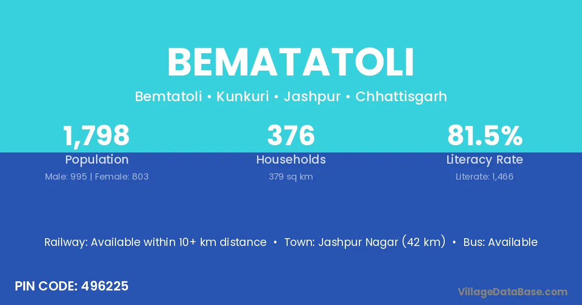 Jashpur Nagar (42 km) is the nearest town to Bematatoli village for major economic activities and is located approximately 42 km away.