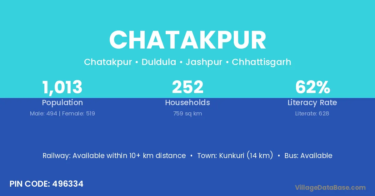 Kunkuri (30 km) is the nearest town to Chatakpur village for major economic activities and is located approximately 30 km away.