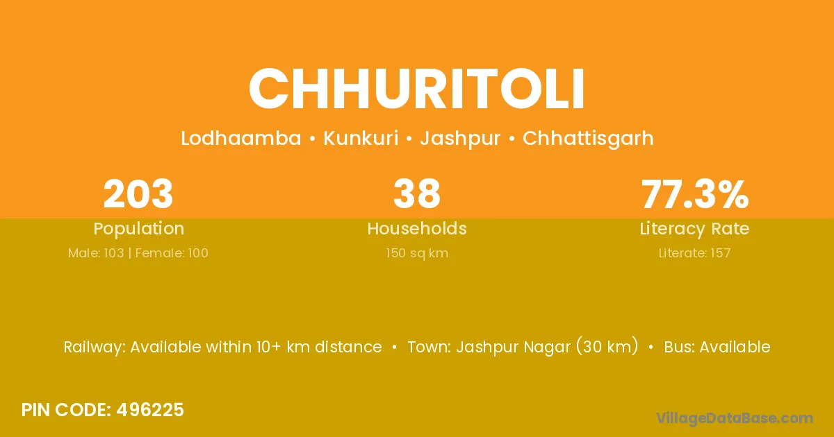 Jashpur Nagar (30 km) is the nearest town to Chhuritoli village for major economic activities and is located approximately 30 km away.