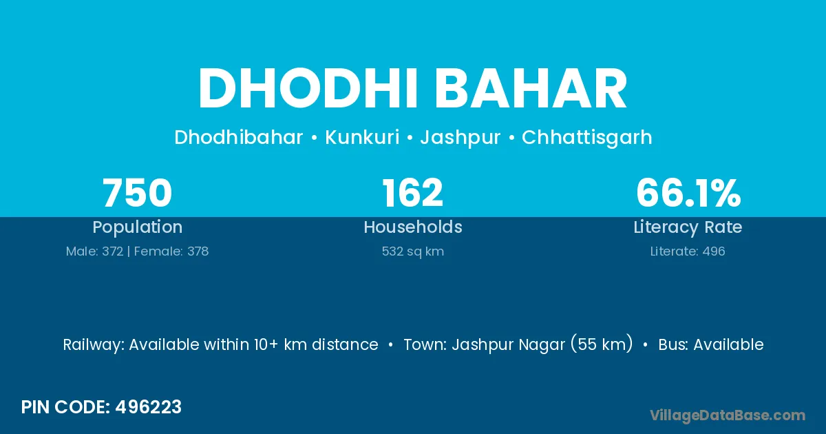 Jashpur Nagar (55 km) is the nearest town to Dhodhi Bahar village for major economic activities and is located approximately 55 km away.