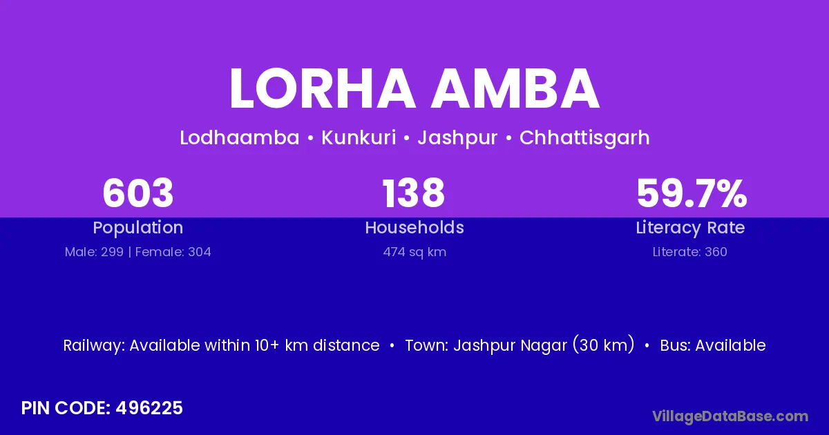 Jashpur Nagar (30 km) is the nearest town to Lorha Amba village for major economic activities and is located approximately 30 km away.