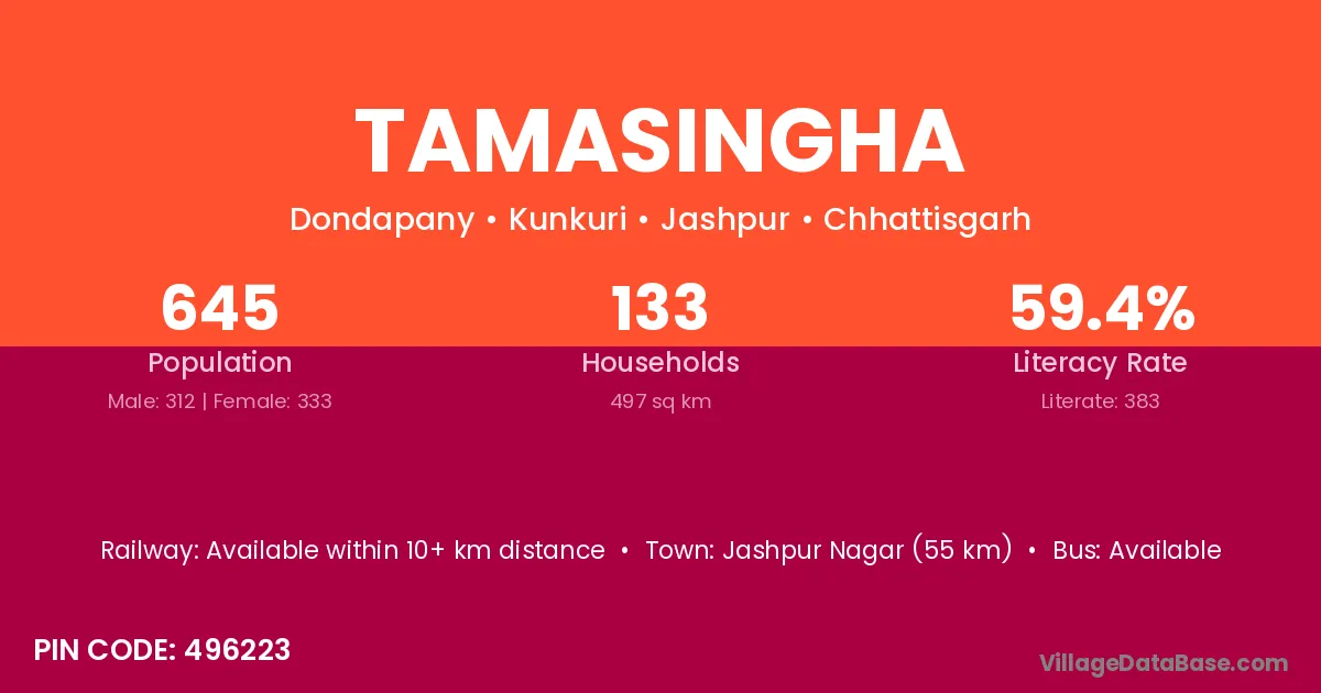 Tamasingha village has a total population of 645 people, of which 312 are males and 333 are females.
