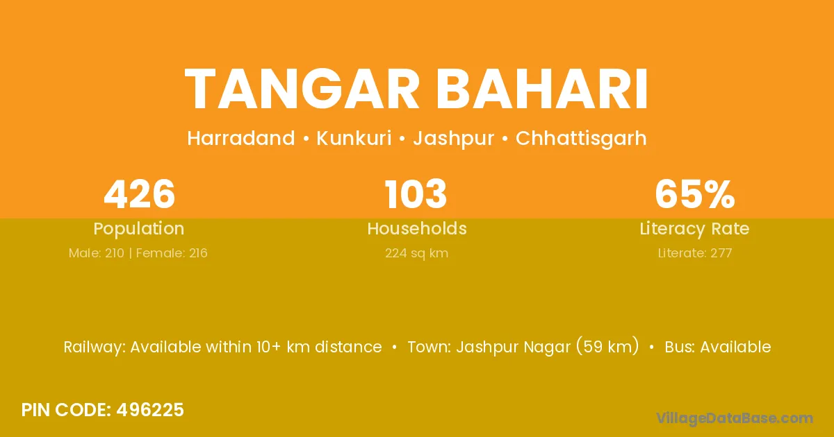 Jashpur Nagar (59 km) is the nearest town to Tangar Bahari village for major economic activities and is located approximately 59 km away.