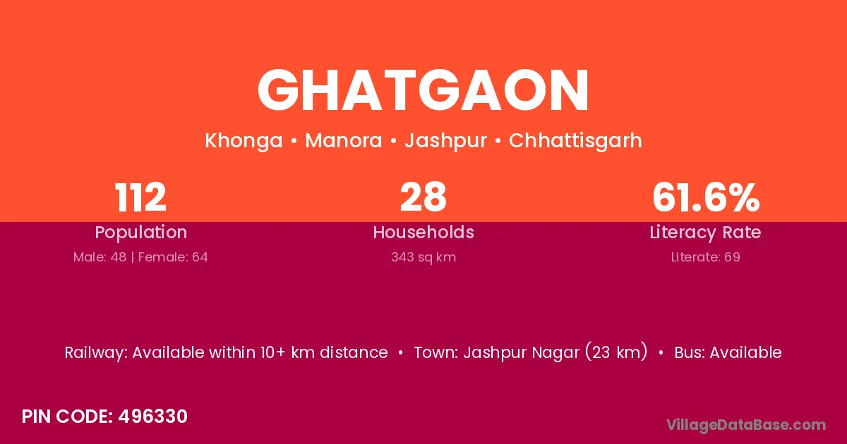 Jashpur Nagar (23 km) is the nearest town to Ghatgaon village for major economic activities and is located approximately 23 km away.