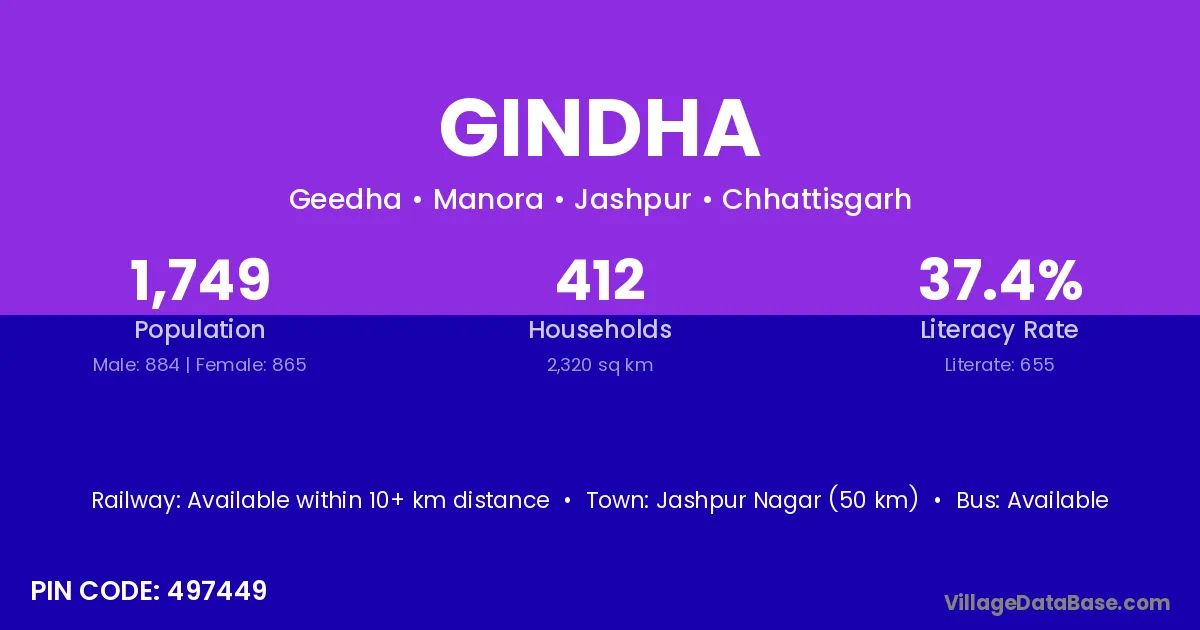 Jashpur Nagar (50 km) is the nearest town to Gindha village for major economic activities and is located approximately 50 km away.