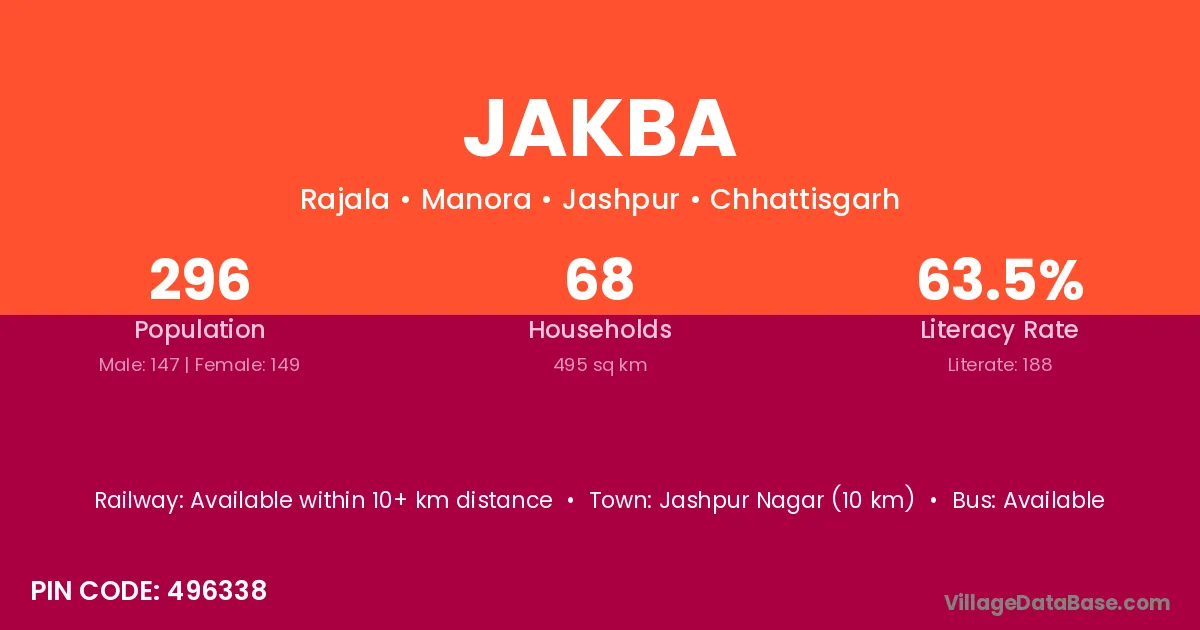 Jashpur Nagar (10 km) is the nearest town to Jakba village for major economic activities and is located approximately 10 km away.