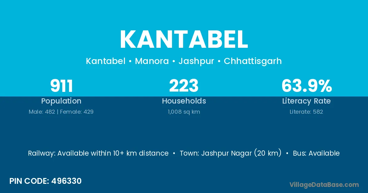 Jashpur Nagar (20 km) is the nearest town to Kantabel village for major economic activities and is located approximately 20 km away.