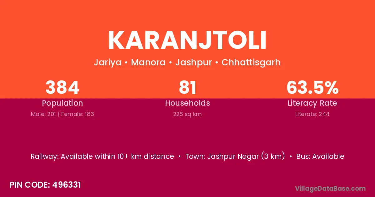 Jashpur Nagar (3 km) is the nearest town to Karanjtoli village for major economic activities and is located approximately 3 km away.
