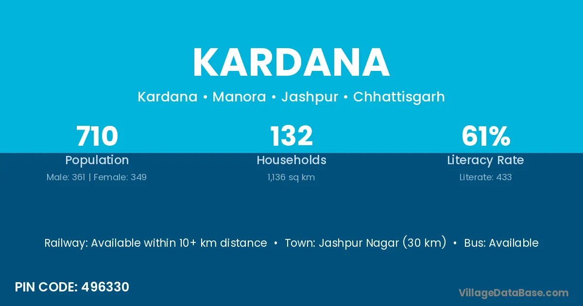 Jashpur Nagar (30 km) is the nearest town to Kardana village for major economic activities and is located approximately 30 km away.