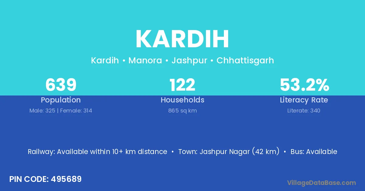 Jashpur Nagar (42 km) is the nearest town to Kardih village for major economic activities and is located approximately 42 km away.