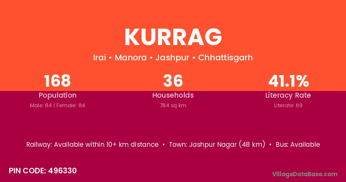 Jashpur Nagar (48 km) is the nearest town to Kurrag village for major economic activities and is located approximately 48 km away.