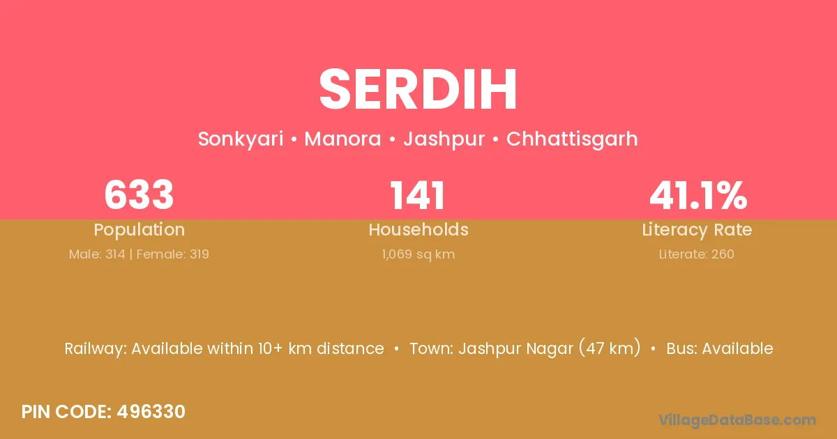 Jashpur Nagar (47 km) is the nearest town to Serdih village for major economic activities and is located approximately 47 km away.