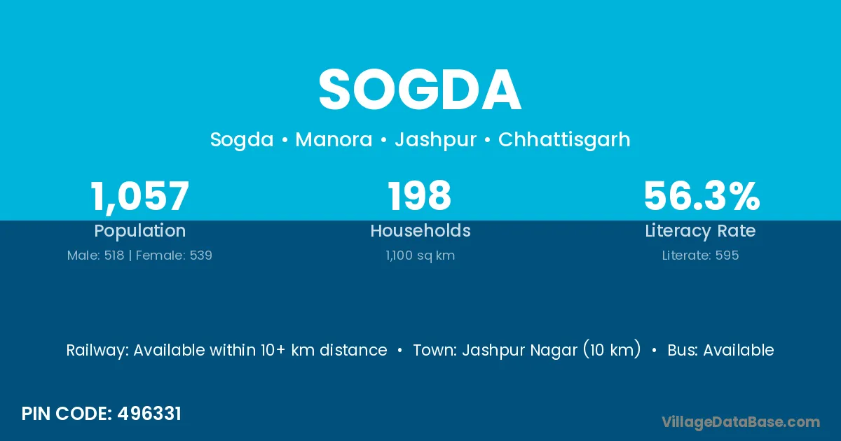 Jashpur Nagar (10 km) is the nearest town to Sogda village for major economic activities and is located approximately 10 km away.