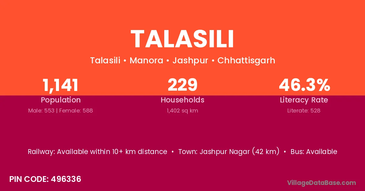 Jashpur Nagar (42 km) is the nearest town to Talasili village for major economic activities and is located approximately 42 km away.