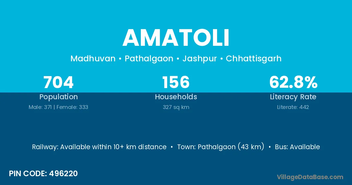 Pathalgaon (43 km) is the nearest town to Amatoli village for major economic activities and is located approximately 43 km away.