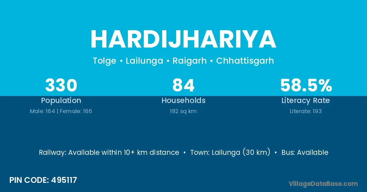Pathalgaon (33 km) is the nearest town to Hardijhariya village for major economic activities and is located approximately 33 km away.